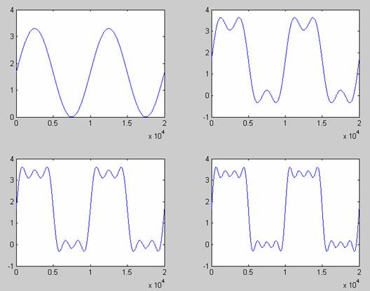 抛开枯燥的理论分析,我们用实验来直观的分析方波中的频率成分,看看不同频率的正弦信号是如何叠加成为方波的。首先我们把一个1.65v的直流和一个100MHz的正弦波形叠加,得到一个直流偏置为1.65v的单频正弦波。我们给这一信号叠加整数倍频率的正弦信号,也就是通常所说的谐波。3次谐波的频率为300MHz,5次谐波的频率为500MHz,以此类推,高次谐波都是100MHz的整数倍。图1是叠加不同谐波前后的比较,左上角的是直流偏置的100MHz基频波形,右上角时基频叠加了3次谐波后的波形,有点类似于方波了。左下角是基频+3次谐波+5次谐波的波形,右下角是基频+3次谐波+5次谐波+7次谐波的波形。这里可以直观的看到叠加的谐波成分越多,波形就越像方波。