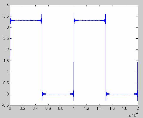 因此如果叠加足够多的谐波,我们就可以近似的合成出方波。图2是叠加到217次谐波后的波形。已经非常近似方波了,不用关心角上的那些毛刺,那是著名的吉博斯现象,这种仿真必然会有的,但不影响对问题的理解。这里我们叠加谐波的最高频率达到了21.7GHz。