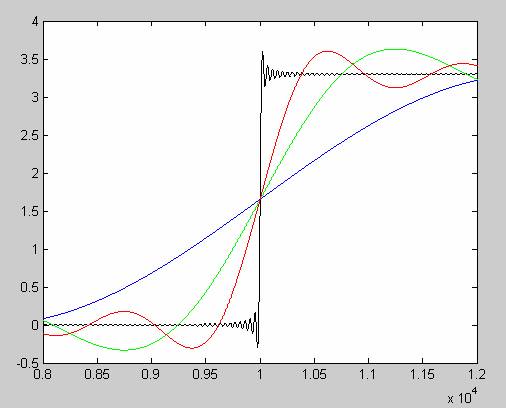 现在我们看看叠加不同频谱成分对上升沿的影响。图3是对比显示。蓝色是基频信号上升边,绿色是叠加了3次谐波后的波形上升边沿,红色是基频+3次谐波+5次谐波+7次谐波后的上升边沿,黑色的是一直叠加到217次谐波后的波形上升边沿。