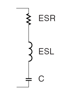 实际的电容器总会存在一些寄生参数,这些寄生参数在低频时表现不明显,但是高频情况下,其重要性可能会超过容值本身。图4是实际电容器的SPICE模型,图中,ESR代表等效串联电阻,ESL代表等效串联电感或寄生电感,C为理想电容。