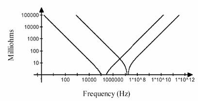 容值不同的电容具有不同的谐振点。图11画出了两个电容阻抗随频率变化的曲线。