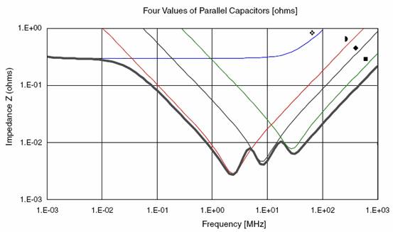 图13是一个电容组合的例子。这个组合中使用的电容为:2个680uF钽电容,7个2.2uF陶瓷电容(0805封装),13个0.22uF陶瓷电容(0603封装),26个0.022uF陶瓷电容(0402封装)。图中,上部平坦的曲线是680uF电容的阻抗曲线,其他三个容值的曲线为图中的三个V字型曲线,从左到右一次为2.2uF、0.22uF、0.022uF。总的阻抗曲线为图中底部的粗包络线。