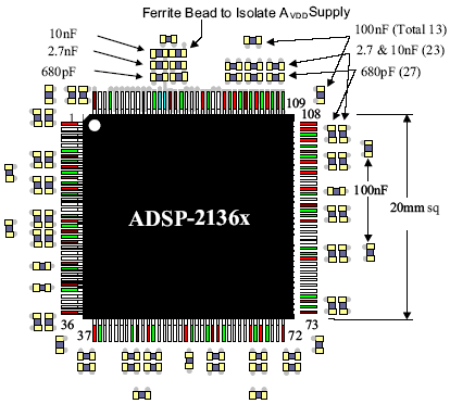 对于电容的安装,首先要提到的就是安装距离。容值最小的电容,有最高的谐振频率,去耦半径最小,因此放在最靠近芯片的位置。容值稍大些的可以距离稍远,最外层放置容值最大的。但是,所有对该芯片去耦的电容都尽量靠近芯片。下面的图14就是一个摆放位置的例子。本例中的电容等级大致遵循10倍等级关系。