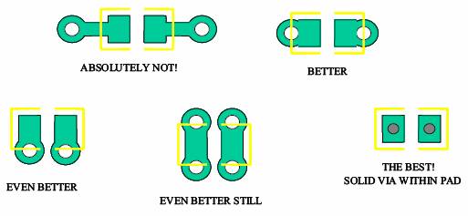 最后一种方法在焊盘上直接打孔,寄生电感最小,但是焊接是可能会出现问题,是否使用要看加工能力和方式。