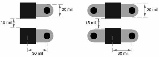由于印制线越宽,电感越小,从焊盘到过孔的引出线尽量加宽,如果可能,尽量和焊盘宽度相同。这样即使是0402封装的电容,你也可以使用20mil宽的引出线。引出线和过孔安装如图17所示,注意图中的各种尺寸。