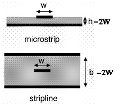 对于常见的FR4板材的PCB板上, 特性阻抗的典型结构如图所示。对于微带线,线宽W是介质厚度h的2倍。对于带状线,线条两侧介质总厚度b是线宽W的两倍。